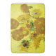 Sunflowers Vincent van Gogh. Still life on a yellow background. A bright bouquet of sunflower flowers stand in a vase. Reproduction of famous works of art images in the public domain.