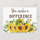 Rustic inspired design with big beautiful bouquet of sunflowers, featuring brown script and mixed typography in the 'you make a difference' quote. Thank someone today for changing your life, brightening your day, make a difference. Great for anyone that inspires you, loves you, makes you smile. Mom, Dad, sisters, brothers, teachers, friends, pastors, youth leaders, worship leaders, cousins....the list goes on and on!