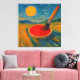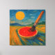 This vivid surreal digital painting features a giant paintbrush planted atop a halved red watermelon, merging nature and creativity in a playful, dreamlike composition. A large yellow sun blazes in a textured, blue-streaked sky, casting warmth across a vast, minimalist landscape painted in flowing greens, blues, and yellows. The scene blends whimsy with symbolic depth—suggesting a world where creation and reality are inseparably entwined.
