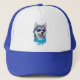 Sunglass-Wearing Husky Dog in Playful Splash Trucker Hat