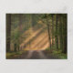 This photo features light rays streaming through the fog that illuminates the fir and cedar trees on a country dirt road.