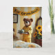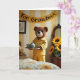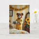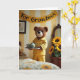 This card shows a cuddly, human-like bear standing sweetly as if offering breakfast in bed, with a gentle smile and a calm, caring gaze ❤️. The bear wears a sunshine-yellow two-piece outfit that looks like cozy sleepwear, and it holds a shiny silver tray level in both paws. On the tray sits a teal teapot decorated with small yellow flowers, placed beside a simple white teacup, like a quiet invitation to share a warm moment. Behind the bear, creamy walls with soft yellow stripes set a sunny, homey room where the scene feels like a tender gesture between close friends. Across the top, a curved golden banner carries the message in dark lettering, centered above the character so your eyes land on it right away. To the right, tall sunflowers bloom from a terracotta pot, echoing the sunflower pattern on the bedding near the bottom edge 🌼. A small framed picture on the left repeats the floral theme, and the teal teapot’s yellow blossoms stand out against the bear’s brown fur and the warm striped background.