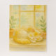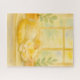 Watercolor illustration of a fluffy cat peacefully curled up on a windowsill asleep, basking in the warm sunlight. She is surround by green leafy potted plants with the sun’s golden warmth all around.