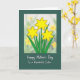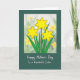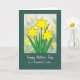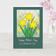 This card features an illustrated cluster of three six-petaled golden flowers, outlined in a warm earthy tone, rising from slender green stems and leafy sprigs that seem to lean toward one another like close friends ❤️. The blossoms sit inside a neat white rectangular frame that sets them apart from the darker background. Behind the main flowers, a softly blurred field of similar yellow blooms and gentle green shapes creates a tender, daydreamy setting. The deep forest-green outer area adds depth and makes the yellows feel even sunnier, like a quiet walk together in early spring 🌼. Below the framed artwork, a short message appears in white lettering, centered and easy to read against the dark green. The text sits with generous spacing, giving the design a calm, affectionate rhythm without crowding the illustration. In the framed scene, the middle flower sits slightly higher than the two beside it, with leaves fanning outward toward the corners.