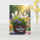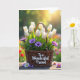 This card shows a rustic woven basket overflowing with white tulip-like blooms and rich purple daisy-like flowers, set in fresh green foliage that leans toward the light like a gentle embrace ❤️. Warm golden sunlight pours in from the upper right, making the white petals look almost translucent and giving the purple blossoms a cozy, affectionate glow. Behind the basket, the garden fades into a soft blur of greens with hints of orange and pale pink, like a quiet moment shared between close friends. Along the basket’s side, the message “To a Wonderful Friend” appears in small white lettering, placed neatly so it follows the curve of the weave. The contrast of the white text against the tan basket keeps the words easy to spot without overpowering the flowers. On the wooden surface below, a few loose purple and white petals rest nearby, as if they drifted down during a caring handoff 🌼. The basket’s woven texture is clearly visible, with tight, crisscrossed strands and a slightly darker rim along the top edge.