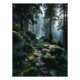 Golden sunlight pours through towering evergreen canopies, illuminating a winding stone path blanketed in soft moss and scattered rocks. Mist drifts gently among ferns and tree trunks, diffusing the warm rays into a dreamy, almost sacred glow. The composition radiates profound calm, timeless solitude, gentle renewal, the quiet magic of untouched wilderness, and the call to step deeper into nature’s embrace—perfect for meditation rooms, bedrooms, home offices, therapy spaces, nature-inspired living areas, or as soul-soothing gifts for hikers, mindfulness seekers, forest lovers, or anyone craving peace, grounding, daily inspiration, or reminders of inner stillness.