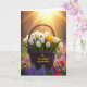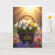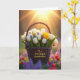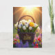 The front design shows a dark, tightly woven wicker basket filled with fresh flowers, set in the middle of a sunlit meadow where everything feels gently welcoming ❤️. Most of the blooms are white tulips with closed, smooth petals, gathered close together as if they’re keeping each other company. One yellow tulip stands slightly higher than the rest, adding a sunny note that draws the eye like a friendly hello 🌼. Small clusters of deep lavender flowers are tucked between the tulips, giving the arrangement extra texture and a soft contrast. Warm golden light pours in from the upper right, and the rays create a tender glow that makes the scene feel like a quiet shared moment. Across the front of the basket, the message “To a Wonderful Grandmother” is placed in flowing, dark lettering that follows the curve of the weave. In the background, the green field fades into a soft blur with faint purple and crimson wildflowers scattered behind the basket.