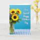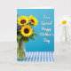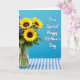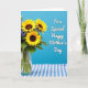 Designed with a bright floral still life, the card centers on a clear glass vase holding three sunny yellow blooms with deep maroon centers, their green leaves fanning out like they’re leaning toward each other in a friendly huddle ❤️. Small clusters of soft blue flowers peek between the larger blossoms, adding a gentle contrast that feels like a quiet companion beside the main bouquet. The arrangement sits to the left, leaving open space on the right where a short message appears in white lettering. The text is placed in the upper-right area against a smooth, light blue background, so it stands out without crowding the flowers. Below the vase, a blue-and-white checkered tablecloth adds a cozy, homey setting, like a shared breakfast table 🌼. Light falls softly across the petals and the water, making the stems visible through the glass and giving the scene a tender, close-up intimacy. The background stays an even sky-blue, while the white message lettering curves gently above the table line near the right side.