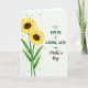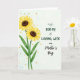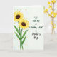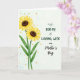 This card shows a tall, vertical design that pairs two sunny flowers with a loving message on a calm, airy background ❤️. On the left, two large blossoms with sun-yellow petals circle deep brown centers, like warm faces turned toward someone they adore. Their slim green stems rise upward with a few curved leaves, adding a gentle, affectionate flow as if they’re leaning in together. Behind them, a pale blue wash fills the space, sprinkled with small warm orange dots that feel like soft confetti drifting across the page 🌼. On the right side, the words “FOR MY LOVING WIFE” sit above “on Mother’s Day,” arranged in stacked lines for easy reading. The lettering is dark green and slightly flowing, and it stands out clearly against the light background without crowding the flowers. The orange dots are scattered most noticeably across the upper and middle areas, with plenty of open blue space around the text and blooms.