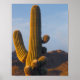 Sunlit saguaro cactus against blue skies and low mountain range of the Arizona desert. Photographed at Sabino Canyon, Tucson, Arizona