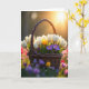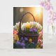 Designed with a rustic woven basket as the main focus, this scene shows spring flowers gathered closely together like friends leaning in ❤️. A dark wicker handle arches over the arrangement, adding texture and a cozy, down-to-earth feel. Inside the basket, tall white tulips catch the backlight so their petals look softly see-through, as if glowing from within. One yellow tulip rises among them like a sunny note in the middle of a gentle conversation, while deep purple crocuses cluster nearby with warm golden centers. In the upper right, late-afternoon sunlight breaks through in a bright flare, washing the background in a golden haze. Any greeting text would sit best near the lower left in a light, simple font, using a soft gray or pale gold that won’t fight the brightness 🌼. Behind the basket, the field fades into a blur of magenta, violet, and soft yellow blossoms scattered across green ground.