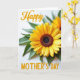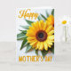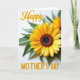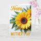 Designed with a bright, sun-kissed flower as the main focus, the card places a golden-yellow bloom in the lower right where its neatly arranged petals open outward like a welcoming gesture ❤️. The center of the flower is richly textured, mixing deep burgundy and near-black tones that feel like a close, steady embrace against the lighter petals. Behind it, a second bloom appears softly out of focus, adding depth like a gentle companion lingering nearby. Crisp green leaves frame the flowers on both sides, their sharp edges creating a tidy border against the wide white background. Near the top, the word “Happy” sits in flowing gold lettering, slightly airy and open, giving the design room to breathe. Near the bottom, “MOTHER’S DAY” is set in thick gold capital letters, evenly spaced and easy to spot, with a small 🌼 accent nearby. The background stays bright white, and the lower-right flower shows a dark, patterned core surrounded by glowing yellow petals and a few pointed green leaves.