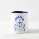 A retro-style coffee poster in blue and cream tones featuring a cheerful, cartoon coffee cup and vintage typography.