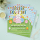 Cute easter egg hunt event flyer features a happy white easter bunny holding an egg, colorful eggs, banner, fun & colorful typography, green grass & flowers. Customize to your liking.
