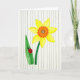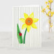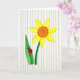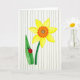 This card features a stylized yellow flower centered on an off-white background with soft gray vertical stripes, with petals fanning outward around an orange-red center. Inside the flower’s middle, a small star-like detail in white and brown draws the eye like a quiet shared secret between friends. A curved green stem supports the bloom, and a wide green leaf reaches out to the side as if offering a gentle perch. Resting on that leaf is a small rounded red insect with black spots and a tiny dark head, adding a sweet, companionable touch 🌷. The colors stay simple—sunny yellow, rich green, and warm red-orange—so the scene feels like a calm morning walk together. Any lettering would sit neatly above or below the flower in a plain, easy-to-read dark tone without crowding the artwork. The background stripes remain light and slightly uneven, running vertically behind the flower and leaf 🐰.