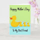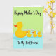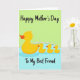 Designed with a soft, pastel palette, this card shows a calm scene split by a wavy white line, with pale green above and light blue below like quiet water. Four sunny yellow waterfowl glide in a gentle line, led by a larger one with an orange beak and a small crest that seems to watch over the others with a caring tilt ❤️. Three smaller birds follow closely behind, their neat spacing suggesting closeness and steady companionship. The simple shapes and rounded forms give the group an easy, affectionate look, like friends staying together on a peaceful walk. Near the top, the words “Happy Mother’s Day” appear in slender black lettering against the green area. Near the bottom, “To My Best Friend” sits in matching black lettering over the blue area, balancing the layout 🌼. The bright yellow birds stand out warmly against the cool background, with the leader placed slightly ahead of the trio along the center of the card.