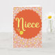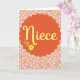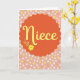 This card features a large tangerine-orange badge at the center, edged with scallops like a blooming rosette, giving the layout a cozy, affectionate focus ❤️. Across the orange shape, the word “Niece” appears in flowing yellow lettering, standing out clearly against the warm background. Beneath the lettering, a sunny yellow flower with rounded petals leans in like a small, friendly nod. Next to it, a slim light-blue sprig with two softly outlined apricot leaves adds a gentle, caring touch, like a little bouquet offered with a quiet smile 🌼. The main emblem sits on a blush-pink field that keeps everything soft and welcoming. Scattered across the pink area are evenly spaced polka dots in white, pale yellow, and muted peach, adding light texture without crowding the center. The orange badge remains the focal point, framed by the tiny floral details and the dotted background. The dots are round and small, repeating across the blush-pink space in a neat, balanced pattern.