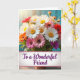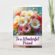 Designed with a lush bouquet of daisy-like flowers, the scene centers on white petals with sunny yellow centers surrounded by soft pink, warm orange, deep red, and touches of purple among leafy greens 🌼. Light falls in from the upper left, giving the petals a gentle glow that feels like a quiet, caring gesture shared between close friends ❤️. The background stays softly out of focus in a calm teal tone, keeping attention on the layered blooms in the foreground. Near the bottom, a bright white banner stretches across the width, creating a neat space for the message. The words “To a Wonderful Friend” sit centered on the banner in flowing purple lettering, standing out clearly against the white. The mix of colors feels lively but balanced, like a friendly embrace captured in flowers. Small purple blossoms and warm red accents peek through the greenery around the central white daisies, with the teal blur continuing behind them.