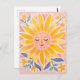 Brighten someone's day with this delightful postcard featuring a whimsical sunflower with a serene, smiling face. Painted in vibrant yellows and soft pinks, this artwork is a burst of joy and warmth. It's perfect for sending sunny wishes, thank you notes, or just as a cheerful addition to any collection of nature-inspired art.