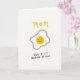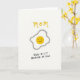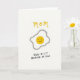 This Mother's Day card shows a simple illustration on a creamy off-white background, centered around a sunny yellow circle that looks like an egg yolk with two tiny black eyes and a small curved smile ❤️. Around it sits an uneven white egg shape, traced with a thin gray outline that feels soft and a little cozy. The friendly face and warm yellow tone give the image a gentle, affectionate mood, like a quiet inside joke between close family or friends. Near the top, the word “mom” appears in yellow, written in a loose, flowing style that matches the yolk’s color. Under the egg, the phrase “EGG-ZIST BECAUSE OF YOU!” is set in dark gray, in straightforward all-caps lettering that stands out clearly. The spacing keeps everything balanced, with the top word hovering above the egg and the longer line anchored below it 🌼. The white egg shape has a slightly wavy edge, and the gray outline looks lightly sketched rather than perfectly even.