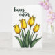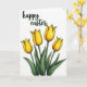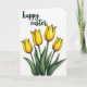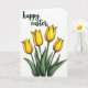 This design shows four cup-shaped spring blossoms clustered together, each outlined in thick black lines with sunny yellow petals shaded for a gentle, rounded look. Deep green stems rise from the bottom, and wide green leaves spread outward as if leaning in close like friends sharing a quiet moment 🌷. The background stays white, letting the yellow and green stand out and keeping the scene airy and open. In the upper left area, a short greeting appears in dark green cursive-style lettering, angled slightly so it feels like it’s speaking down toward the flowers. The flowing letter shapes mirror the curved petals, tying the message to the bouquet without crowding it. The flowers sit centered and low on the card, leaving comfortable space above for the words and giving the layout a calm, balanced rhythm 🐇. Fine shading along the petals and leaves adds depth, with darker green tucked near the veins and lighter green along the edges. The yellow blooms show soft shadowing near the base of each cup, and the dark green text rests clearly in the top-left corner against the white space.