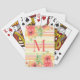 Fun playing cards set with room to customize or personalize with monogram and family name of your choice, on a contemporary summery coral orange, yellow, and light green floral and stripes watercolor pattern design background.