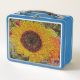 Add some floral fun to your daily lunch with this whimsical sunflower lunchbox. Whether it's for lunches for your son or daughter, a commuter's lunches for yourself, or for fun picnics, this useful lunchbox will add a touch of cheer and color. This image is based on an original photograph of a sunflower in a summer garden , which has digital effects applied to make it look a bit impressionistic or almost like string art. This lunchbox is shown with blue trim but is available in other colors and with stainless steel.
