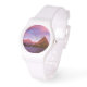 I only have one complaint. I ordered the watch with clear case and strap, and what was sent was white case and strap. I'm going to keep it because 1) it looks very nice in white, and 2) it would take too long to get a replacement made and sent in time for my occasion. Aside from the mix up with the color, the watch does look very good in white. The purple dial is actually sparkly which did not show in the online images. That was a nice surprise. If you like Swatch watches this is very similar to those. It's 33.6mm in diameter, 10.5mm thick, and 40.6mm lug to lug. Stainless steel case back says 3ATM/30m WR, so no swimming or showering or submerging this one. If you like Woodstock, this is a great choice.