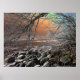Altered digital photograph. Sunrise across the still frozen lake and the rocks of the beach.
