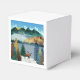 A beautiful landscape with unique colors and textures showing a mountain and lake landscape and multi-colored forest with a rising sun and a moose in shades of blue, green, gold, and magenta.