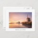 Photo postcard of a landscape with a row of three traditional windmills and reeds along a frozen river during a colorful sunrise in winter in Leidschendam in the Netherlands with a white border and the text 'Holland'.