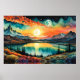 The Sun Rises above a lake in the Mountains, as it shares the sky with the Moon. Colorful landscape and sky.
