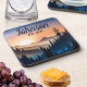 This coaster set with mountain landscape in soothing sunset colors is perfect accent for any cabin or lodge and can be personalized with your desired name and date.