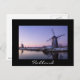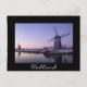 Postcard of the windmills of Kinderdijk along the canal during a purple sunrise in winter in Holland with a black border and the text: 'Holland'.