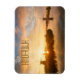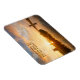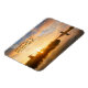Rectangular souvenir photo magnet with a vibrant sunrise over a row of windmills and reflection in the water of the river on a beautiful morning in a countryside landscape in Kinderdijk in the Netherlands with the text 'Kinderdijk, Holland'.
