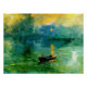 " Sunrise," depicts a serene harbor scene at dawn, where the sun rises above the horizon, casting a soft glow over the water and boats. It's an exemplary example of Impressionist art, with its emphasis on capturing the fleeting effects of light and atmosphere. The painting is prominent for its loose brushwork and vibrant color palette, conveying a sense of tranquility and beauty in nature's daily spectacle.