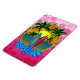 Beautiful beach sunset behind surfboards and palm trees, framed with bamboo and hibiscus flowers.With a pink background of Hawaiian Honu Sea Turtles and hibiscus flowers.