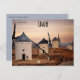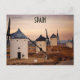 This postcard features windmills in Consuegra, Spain. Located in the province of Toledo, Castile-La Mancha, Spain, Consuegra is a municipality and in 2018, it had a population of 10,098 inhabitants. It is 80 km from Ciudad Real and 60 km from Toledo. Consuegra is located in La Mancha region, famous for its extensive dry plains, vineyards and historical constructions such as windmills. Massimo Frasson from Italia, CC BY-SA 2.0 <https://creativecommons.org/licenses/by-sa/2.0>, via Wikimedia Commons