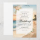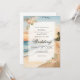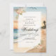 A serene beach scene unfolds, with soft waves meeting a sandy shore under a warm, painted sky. Delicate floral accents frame the image, evoking a gentle and romantic seaside atmosphere. This design captures the tranquility of a coastal setting for a special occasion.