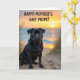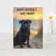 This card shows a short-snouted black dog sitting in the sand near the shoreline, looking straight ahead with deep, gentle eyes that feel like a loyal friend keeping you company ❤️. Tufts of pale beach grass rise around the dog in the foreground, adding a soft, breezy frame. Behind it, the ocean stretches out calm and glassy, catching the last light of day. The sunset sky blends warm orange, golden yellow, and honey tones, with the sun low on the horizon and a bright reflection leading across the water. Across the upper half of the scene, the message “HAPPY MOTHER’S DAY MOM!” is placed prominently in dark lettering that stands out against the glowing sky 🌼. The words are centered and large, floating above the dog’s head without covering its face, so the tender, devoted gaze remains the focal point. The contrast between the dog’s glossy coat and the luminous background makes the silhouette feel crisp against the light. Fine grains of sand and a thin line of foamy water are visible along the lower edge, while the sun sits as a round, bright orb near the distant horizon.