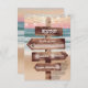 Romantic ocean wedding response card featuring a lush sunset, sandy beach, string twinkle lights and your rsvp wording written on a rustic wooden signpost.