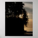 A sunset silhouette of a tree covered bluff, on the coast of Washington.