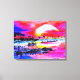 In this mesmerizing painting, I've skillfully captured the exquisite beauty of a radiant sunset, showcasing a breathtaking palette of vivid reds and delicate hints of blue. The sky is adorned with a graceful arc of golden yellow sun, casting a warm, ethereal glow. In the foreground, majestic palm trees stand tall, their silhouettes beautifully contrasting against the vivid hues of the evening sky. Amidst this picturesque setting, fishermen glide peacefully in a canoe, their figures harmonizing with the serene ambiance. This artwork invites viewers into a tranquil world, where nature's splendor and human existence coalesce in a stunning dance of colors and tranquility.