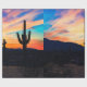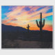 Remarkable sunset scene in the barren desert landscape at dusk! The desert landscape looks like a silhouette outlined with Saguaro cactus, dry brush, and a mountainous background. Brilliant colorful hues of blue and orange set the sky on fire in this sunset desert photo shot.