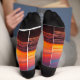 The Sunset Chaser Socks feature a captivating design inspired by the warm hues of a sunset. Gradient tones of orange, pink, and purple flow seamlessly from the cuff to the toe, mimicking the colors of a twilight sky. The pattern includes subtle silhouettes of palm trees and a winding path, evoking feelings of relaxation and exploration. These socks offer a stylish and comfortable way to bring the serenity of sunset chases to your everyday look. Perfect for adventurers and dreamers alike.
