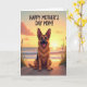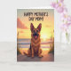 This card features an affectionate seaside scene with a sturdy dog in the foreground, sitting tall with pointed ears, an open-mouthed grin, and a little tongue showing as if it’s waiting for a beloved friend ❤️. Its warm, golden-brown coat is shaded softly, giving the fur a cozy look that matches the gentle, welcoming mood. Behind the dog, the sun sinks toward the horizon, blending pale gold, deep orange, and light lavender across the sky and reflecting in a calm ocean. Low waves brush the shoreline, and sandy dunes frame the view so the dog feels like it’s sharing the sunset with you. On both sides, slender grasses rise from the sand with small purple touches, adding a quiet, romantic softness 🌼. Near the top, a short message appears in simple uppercase lettering, centered and set in a light color that stands out against the darker sky. The composition keeps the dog large and close, while the coastline stretches wide behind it, like a tender moment held in a big open world. The final detail is the glowing sun sitting just above the waterline, with lavender clouds fading upward and thin dune grasses edging the scene.