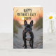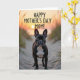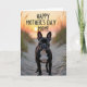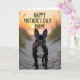 This card shows a dark-coated dog standing attentively on a sandy path, its short sleek fur set off by a bright white chest and deep eyes that seem to hold a tender, trusting gaze ❤️. Its ears are upright, as if listening for someone just out of frame, adding a gentle sense of closeness to the scene. The path winds through low dunes, with thin dune grass leaning in on both sides like a natural aisle. In the distance, a low sun spreads golden and soft orange light across the horizon, warming the sand and giving the moment a calm, affectionate feel. The background softens into a blurred wash that suggests open sky and far-off water, keeping the focus on the dog in the foreground. Across the top, the message “HAPPY MOTHER’S DAY MOM!” is placed in uppercase lettering, standing out clearly against the glowing sky in a light tone 🌼. Fine ripples and small shadows in the sand are visible along the pathway beneath the dog’s paws.