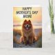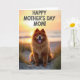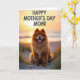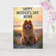 Designed with a cozy seaside scene, the front features a fluffy dog with reddish-golden fur sitting calmly on pale sand among thin beach grasses. Its bright eyes and open-mouth grin, tongue showing, feel like a friendly welcome meant for someone it adores ❤️. Behind it, the low sun washes the sky in soft orange, warm gold, and creamy tones that blend along the horizon. Gentle backlight outlines the dog’s thick coat with a glowing rim, adding a tender, affectionate look to its relaxed pose. A quiet stretch of water sits in the distance, keeping the setting calm and unhurried. Across the upper area, large shadowed letters in dark ink read “HAPPY MOTHER’S DAY MOM!” with the words standing out against the bright sky 🌼. The grasses lean slightly to one side, and the dog’s fur catches the light in fine, glowing strands.