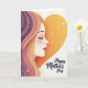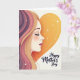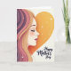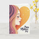 This card shows a calm side-profile of a woman with her head slightly bowed and eyes closed, as if leaning into a quiet, affectionate moment 👩. Her long hair flows in layered waves, shifting from deep purples and rosy tones into warm golden-blond strands that feel like a soft embrace around her face. A gentle blush warms her cheek, and her rose-tinted lips curve subtly, suggesting tenderness without needing a direct gaze. To the right, a large glowing heart in golden-orange fills much of the space, like a warm light she’s turned toward ❤️. The heart features tiny dotted details and small spark-like highlights that echo scattered glints tucked through her hair. The background stays creamy and light, letting the sunset-like colors stand out while keeping the scene soothing and intimate. Near the lower right, a short greeting appears in flowing lettering, set in a dark contrasting color that remains easy to spot against the pale backdrop. The heart’s surface shows a neat pattern of dots and faint shimmer marks along its edges.