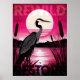 A striking line art image of heron standing in a lake against a magenta sunset sky. The words Rewild and Restore are integrated into the illustration to make a bold and urgent statement without overpowering the beauty of the image.